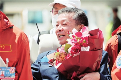 着陆当日 航天员乘组 平安抵京 费俊龙手捧妻子为其送上的鲜花。