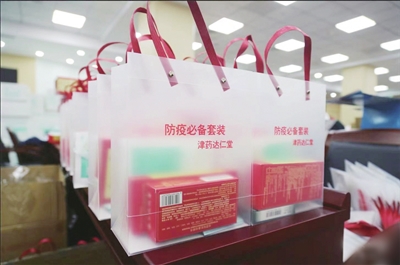 天津医药集团一直把“人民至上 生命至上”放在首位。2022年底,疫情转入优化防控,针对重点人群药品保障工作,为确保全社会稳妥过渡,最大限度保障人民群众生命安全,天津向重点人群免费发放“健康防疫包”。为了将这份药品保障尽快送到重点人群家中,作为首批“健康防疫包”的承办单位,天津医药集团迅速响应,100多名员工奋战了24小时。2022年12月18日凌晨2点,天津医药集团津药达仁堂总部灯火通明,100多名员工正在连夜赶制15万个“健康防疫包”。“健康防疫包”立足社会重点人群健康防疫需要,包含清咽滴丸、藿香正气、感冒软胶囊、牛黄上清丸、正痛片、消毒片、N95口罩和抗原测试剂等。