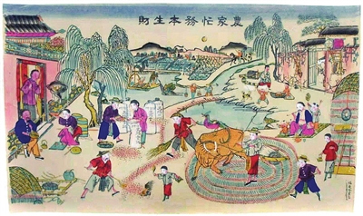 天博馆藏一幅农事题材的清光绪杨柳青年画《农家忙务本生财》。这类题材的杨柳青年画比较多见,像庄稼忙、喜庆丰收、乐庆丰年、耕织全图等,大多用写实的创作方法描绘农业生产活动,表现对丰收的期盼。