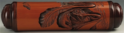 天博馆藏清代竹雕白菜香薰,作品取一整节竹材,平滑圆直,筒两端用紫檀木做盖,刻镂空寿字。筒身表面刻白菜一棵,茎叶逐层深刻,菜心深卷,叶脉毕现,叶片翻卷自然,螳螂藏于叶间,似在吸吮白菜的汁液,另有两只蝴蝶在飞舞。天博器物研究部副主任李君说:“其所刻形象逼真,栩栩如生,显现出自然界生机勃勃的景象。此香薰整体雕饰协调大方,层次分明,玲珑剔透。”