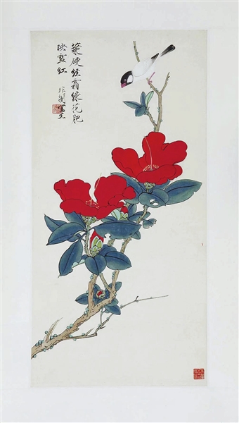 天博馆藏于非闇的《山茶伯劳》,设色强烈不失沉稳,典雅清丽不流于娇媚,生动传神又富有装饰趣味。画中山茶花红颜怒放,树叶繁茂,呈蓝绿色,一只伯劳俯立于山茶枝头,于非闇以深厚繁复的点染、凝练沉稳的笔法勾勒出伯劳的羽毛质感,层次感极强。