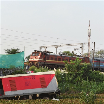 图为6月5日,在印度东部奥迪沙邦巴拉索尔地区,一列火车驶过列车相撞事故路段。