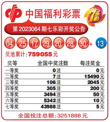 中国福利彩票第2023064期七乐彩开奖公告