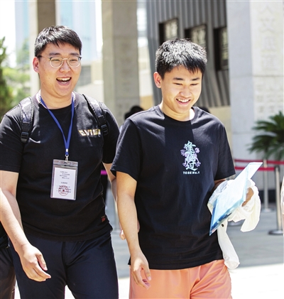 “下午继续加油!”“谢谢您,老师!”昨天11时40分,王鑫迎接走出考场的学生,看到大家自信的脸庞,他开心地笑了。这一刻,学生们也笑了。