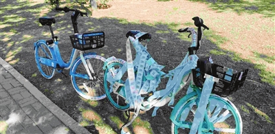 北辰区环瑞路上,有人拿共享单车当交友广告宣传展台。 本报记者 韩爱青