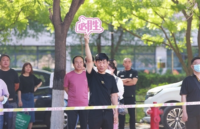 2023年高考于6月7日拉开帷幕,在天津五中考点,送考等候的家长在校门外为孩子加油打气,鼓励孩子高考必胜。