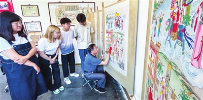 连日来,杨柳青古镇热闹非凡,众多非遗文化项目吸引了来自各地的游客。图为杨柳青木版年画国家级非遗传承人霍庆顺为游客讲解年画历史与技艺。 本报记者 潘立峰 通讯员 袁忠清 摄
