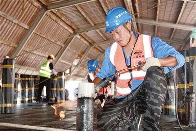 连日来,中铁十八局施工人员冒着高温在滨海新区新开里小区楼顶进行屋面防水卷材的铺设,确保汛期来临之前完工。 本报记者 张磊 摄