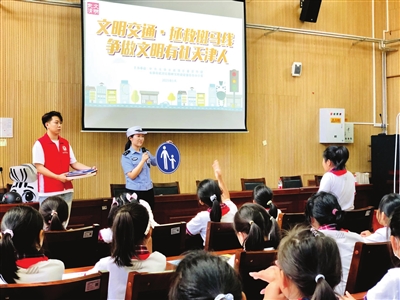 活动中,公安武清分局交警支队警官崔蓝雪从文明走路、文明乘车等方面为学生们讲解了交通知识,手把手指导学生正确佩戴头盔,带学生们做“拯救斑马线”手势操,让交通安全常识走进孩子们心田。