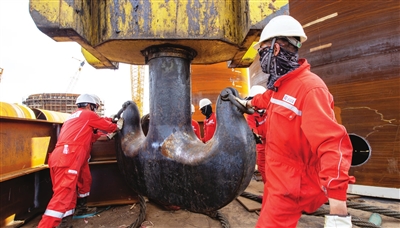 施工人员进行吸力锚吊装准备作业。 海油工程供图