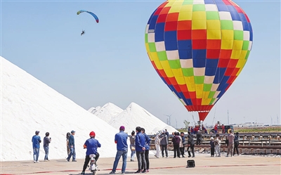 天津盐业风情游览区内,在千年盐场感受热气球和动力滑翔伞的魅力。