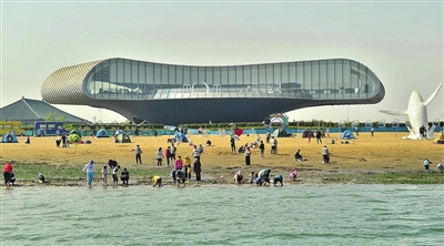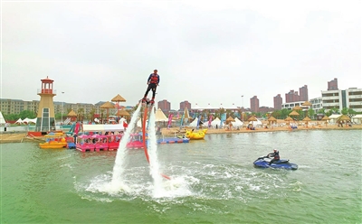 北塘北沙滩露营区,各种水上游乐项目受到市民青睐。