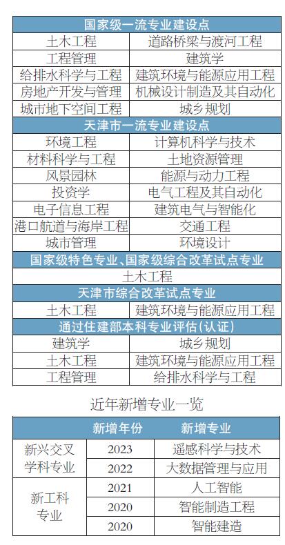 学校以服务新型城镇化和城市现代化进程为己任,面向城建领域合理设置学科专业。现有7大学科群,13个硕士学位授权一级学科,11个专业硕士学位授权类别。有1个天津市一流学科(土木工程)、1个天津市一流(培育)学科(环境科学与工程)、4个天津市特色学科群(城市规划、城市建设、生态城市、城市管理)、4个天津市服务产业特色学科群(绿色低碳建材新技术、建筑工业化及智能建造、城市更新与空间治理、城市水资源化与智能水务)、6个天津市重点学科(材料科学与工程、建筑学、土木工程、环境科学与工程、城乡规划学、管理科学与工程)。工程科学进入ESI全球排名前1%。