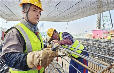 昨日,在中国一冶北京协和医学院天津医院生活附属区项目部,钢筋作业班组人员错峰作业。 本报记者 张磊 摄