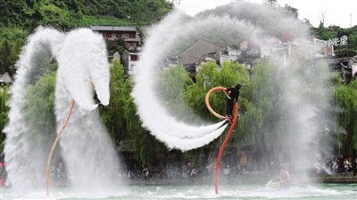 图为6月17日,工作人员在镇远古城 阳河畔进行水上飞人表演。