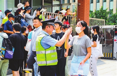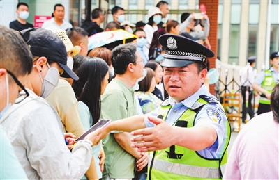 刘庆刚在考场外维持秩序。 本报记者 孙震 潘立峰 通讯员 赵军 摄