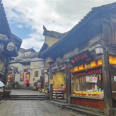 走着走着,就到了河边,这也是三省市的江水交汇处,汇集成了一个幽静的圈。在沈从文传神的笔下,这里如诗,真实绚丽地表现了西南的风土人情,使边城小镇的情趣变得轻快清新。人性渗透着完美,人与人之间有着纯洁自然的爱情,有纯粹的感情。地上铺着青石板,在雨水中走路啪啪作响。找了一个老式茶馆,在窗户那儿就能看到三江汇集的景色,一条船在江中行,一个渔夫在雨中戴着斗笠,摇着桨奋力而行。我想起《边城》结尾,她的情人也许永远不会回来,也许明天会回来,她只能在心里默默为他祈祷。雨似乎停了,但江面上逐渐有了一团团的水烟。