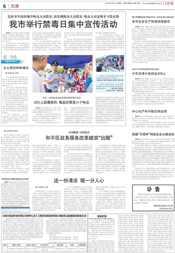 近年来,我市依法严厉打击各类毒品违法犯罪活动,持续开展全民禁毒宣传主题活动,完善毒品治理体系,不断取得新成效。连续多年保持现有吸毒人员数量下降、新发现吸毒人员数量下降、吸毒人员复吸率下降的态势,滨海新区、南开区成为首批“全国禁毒示范城市”。