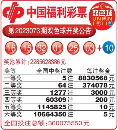 中国福利彩票第2023073期双色球开奖公告