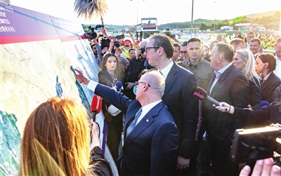 图为6月28日,塞尔维亚首都贝尔格莱德,塞尔维亚总统武契奇(中)在中企承建的贝尔格莱德绕城高速公路路段通车仪式现场观看展板。