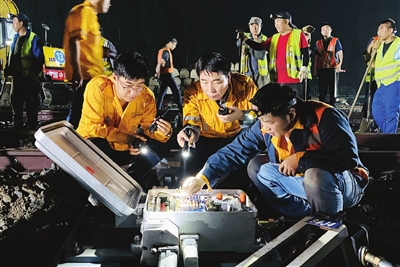 本报讯(记者 万红 摄影 张磊 通讯员 董策)昨天7时30分,经过千余名人员近20小时的奋战,津兴铁路胜芳站两组42号道岔精准插入津保铁路上下行线。这一施工的完成,不仅意味着胜芳站改造主体工程全部结束,还标志着津兴铁路实现正线贯通,为年内开通运营按下“加速键”。