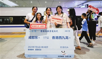 7月1日,铁路部门首次开行成都往返香港的直达高铁,单程运行时间约10小时。当日,搭乘成都东站开往香港西九龙站G2963次列车的旅客在成都东站站台上拍照留念。 新华社发
