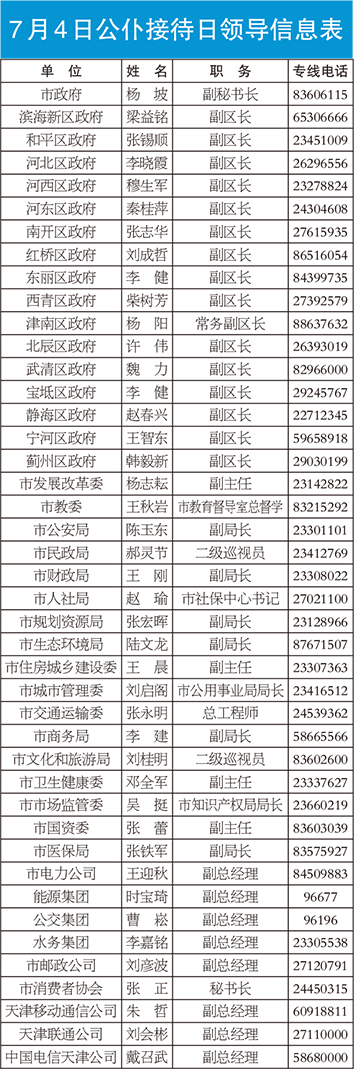 本报讯(记者 高立红)7月4日是公仆接待日,当天9:00—11:30,全市43个单位的负责同志将在各自单位接听热线电话,为市民解释相关政策、解答疑难问题。