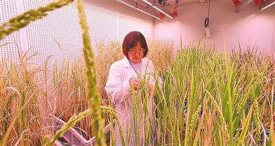 1.天津市农业科学院农作物研究所。科研人员在人工气候室内考察小站稻试验材料性状。