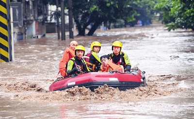 7月4日,重庆万州区,消防救援人员用冲锋舟救援转运被困群众。 新华社发