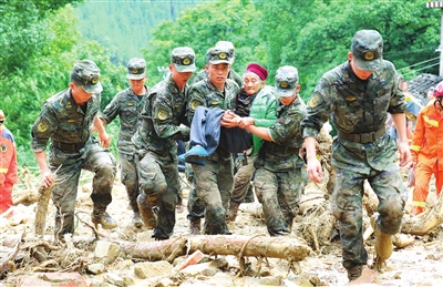 图为7月4日,在重庆市万州区长滩镇,武警官兵在转移被困群众。