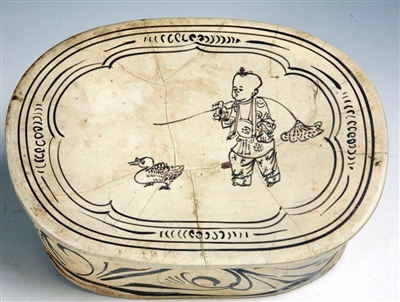 宋磁州窑白釉赭彩童子赶鸭图枕。