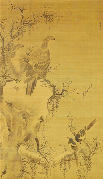 天博馆藏明代汪肇的《鹰石双喜图》轴,图绘悬崖峭壁老树枯枝,两只苍鹰立于山石上,一回首凝视,一平视远方,目光锐利。下方枯枝上两只喜鹊,神态自若,一抬首仰望苍鹰,一俯首张望,上下呼应。山石采用斧劈皴,树叶以破皴点染,画法豪放洒脱。而翎毛却以细笔勾画再加以晕染,用笔工整生动逼真,具有浙派画家的典型特点。