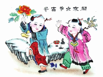 旧版新制的杨柳青年画《斗寒虫争富贵》。