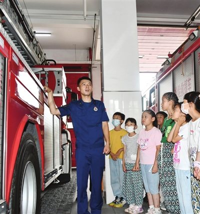 日前,北辰区青(广)源街荣馨园社区组织社区青少年开展“小小消防员”红领巾夏令营活动。青少年在社区工作人员的带领下走进消防队,了解消防知识,增强消防安全意识。 本报记者 孙立伟 通讯员 刘颖 摄