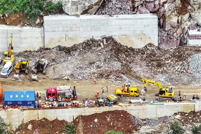 7月9日,救援人员在滑坡现场勘察。新华社发