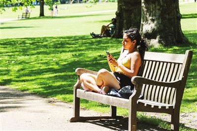 英国 7月7日,一名女子在英国伦敦圣詹姆斯公园沐浴阳光。