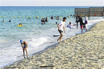 卡塔尔 7月7日,在卡塔尔多哈,人们在海边消暑。