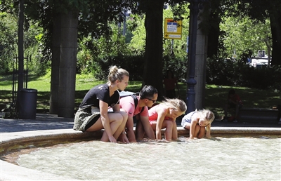 德国 7月8日,人们在德国法兰克福的一处喷泉玩水。