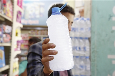 也门 7月9日,一名男子在也门萨那购买冰水消暑。