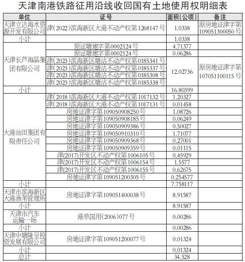 天津南港铁路征用沿线收回国有土地使用权明细表