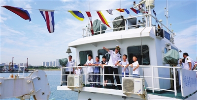 7月11日是我国第19个中国航海日,今年中国航海日活动主题是“扬帆新丝路,奋楫新格局”。当日,在位于山东烟台的交通运输部北海航海保障中心烟台航标处的“海巡15017”轮上,船员为小朋友们讲解航海知识。 新华社发