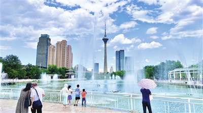图为市民在蓝天白云下的水上公园,尽享“高颜值”美景。