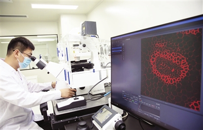 工作人员在影像实验室内运行调试超高分辨共聚焦显微镜。