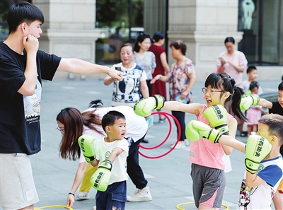 昨日,河东区大王庄街道信和苑社区连同辖区共建单位,为社区学生开展“运动吧”主题活动,运动教练带领孩子们进行小小拳击手体验活动。