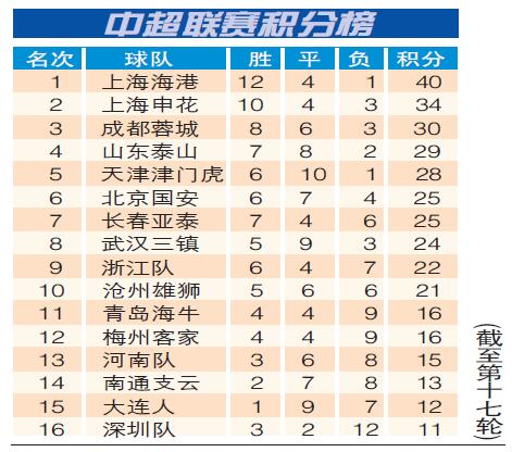 排名积分榜第二位的上海申花队,主场迎战梅州客家队,上半场凭借马莱莱为球队制造点球机会,由巴索戈一蹴而就取得领先。不过,梅州客家队在半场结束前,由罗德里格扳平比分。下半场申花队老将于汉超在禁区内鱼跃冲顶,打入锁定胜局的一球,也稳固了球队在积分榜次席的位置。而同城的上海海港队排名第一,领先申花队6分之多。