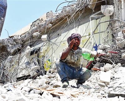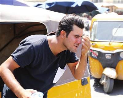 7月18日,在伊拉克巴格达,一名男子用水洗脸降温。