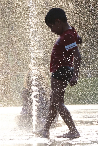 7月17日,一名男孩在西班牙马德里的喷泉中玩耍解暑。 新华社发