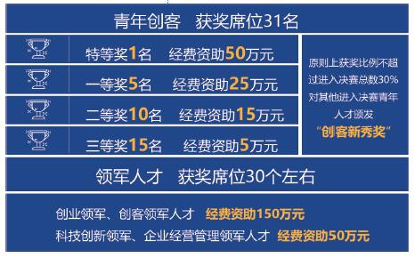 拟支持31名,设特等奖1名,经费资助50万元;一等奖5名,经费资助25万元;二等奖10名,经费资助15万元;三等奖15名,经费资助5万元。原则上获奖比例不超过进入决赛总数的30%。对其他进入决赛青年人才颁发“创客新秀奖”。