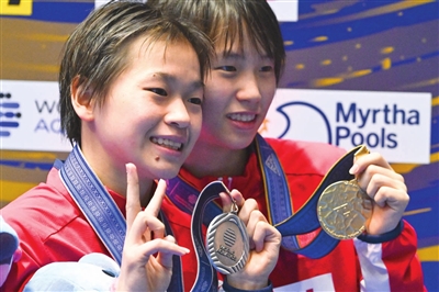 本报讯(记者 李蓓)昨天,在日本福冈举行的2023年世界游泳锦标赛女子10米跳台决赛中,中国选手陈芋汐、全红婵包揽冠亚军。中国代表团在奖牌榜以10金2银2铜傲视群雄,其中9金来自跳水“梦之队”。