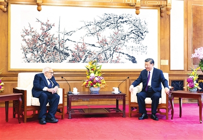 习近平指出,基辛格博士刚刚度过百岁生日,你访问中国已经一百多次。这两个“一百”加在一起,使你这次访华具有特殊意义。52年前,中美两国处在一个关键转折点,毛泽东主席、周恩来总理同尼克松总统和你本人以卓越的战略眼光,作出中美合作的正确抉择,开启了中美关系正常化进程,既造福了两国,也改变了世界。中国人重情讲义,我们不会忘记老朋友,不会忘记你为推动中美关系发展、增进中美两国人民友谊作出的历史性贡献。